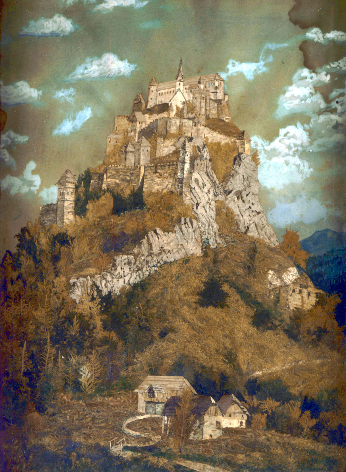 Die Entstehungszeit der Collage lässt sich nur anhand des schlichten Rahmens mit rückseitiger Holzplatte beurteilen. Sie dürfte nicht allzu weit von der Hochzeit der Romantik entfernt sein und irgendwann ins 2. Drittel des 19. Jahrhunderts fallen. Das Ende dieser Zeitspanne fällt in den beginnenden Historismus mit seiner Verklärung des mittelalterlichen Lebens, die in letzter Konsequenz den Boden des überzogenen völkischen Denkens im 20. Jahrhundert mit vorbereitete.