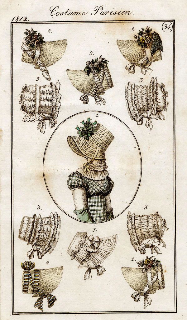 Neueste Pariser Hutmode im Jahr 1812. Obwohl schon mehr als 200 Jahre alt, bekommt man solche Originaldrucke heutzutage auf Flohmärkten fast geschenkt.
