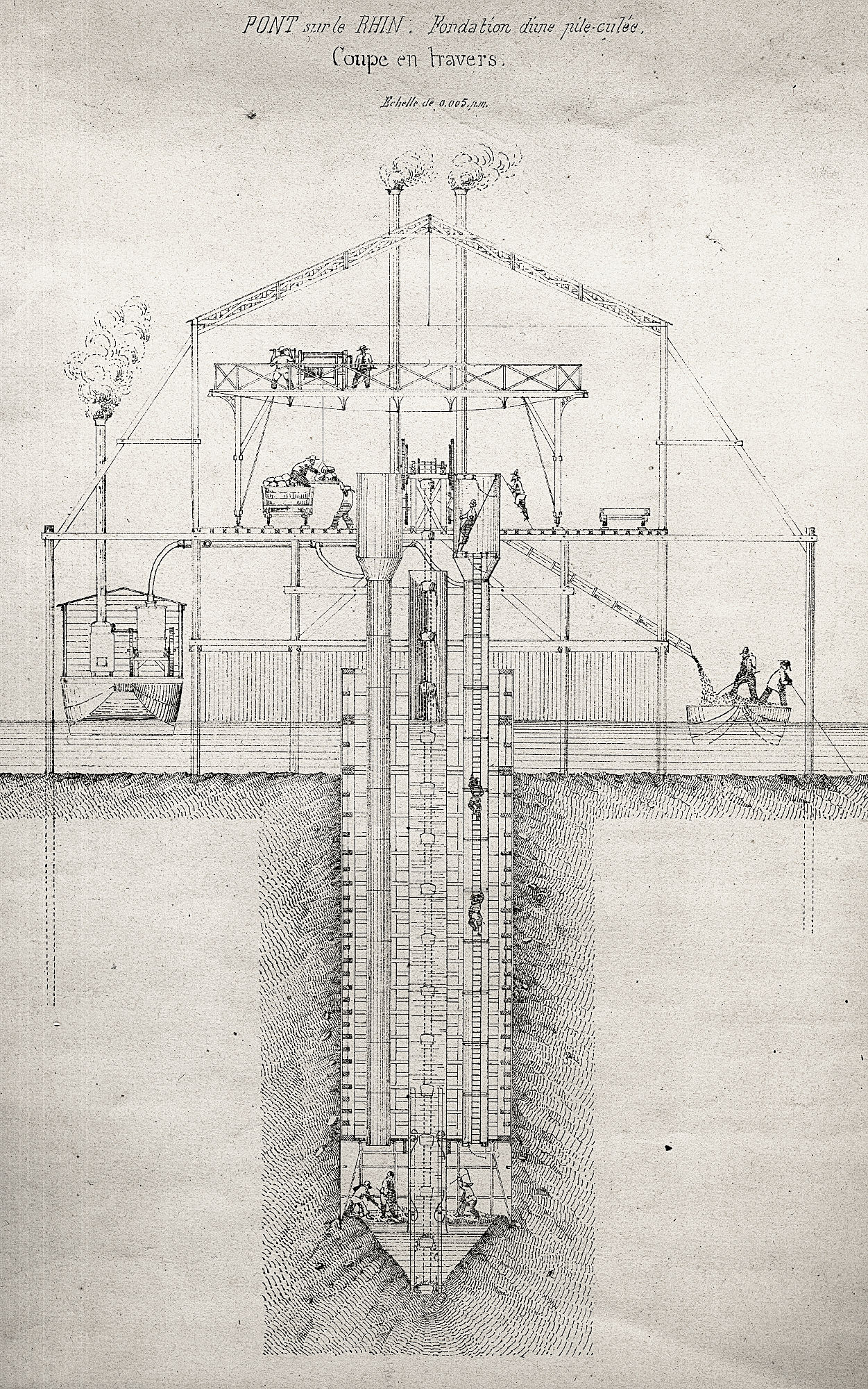 Augenscheinlich verfügte der Gerüstbau über zwei, vermutlich auf Schienen verschiebbare, Dampfmaschinen, von denen nur die beiden Kaminrohre zu sehen sind und welche das durch Ketten verbundene Förderschaufelband antrieben. Eine dritte, auf einem Leichter installierte Dampfmaschine erzeugte dort mittels einer Luftpumpe Druck, der über zwei Rohre in den unter dem Grund des Flusses liegenden Arbeitsraum, einen stählernen Senkkasten (Caisson), geleitet wurde. Das rechte dieser Rohre hatte drei Verschlußklappen, war mit zwei Leitern ausgestattet, und diente mittels dieser Vorrichtungen als Zugangsschleuse. Der Arbeitsraum stand also, wegen des sonst eindringenden Grundwassers, unter permanentem Überdruck. Der eingezeichnete Fördergraben sowie die Förderbandrohre waren mit Wasser gefüllt, was einen Druckausgleich verhinderte. Das untere Ende der nach oben führenden Fördereinrichtung war außerdem mit Abstreifern versehen, um das Herabfallen von Aushub zu verhindern.