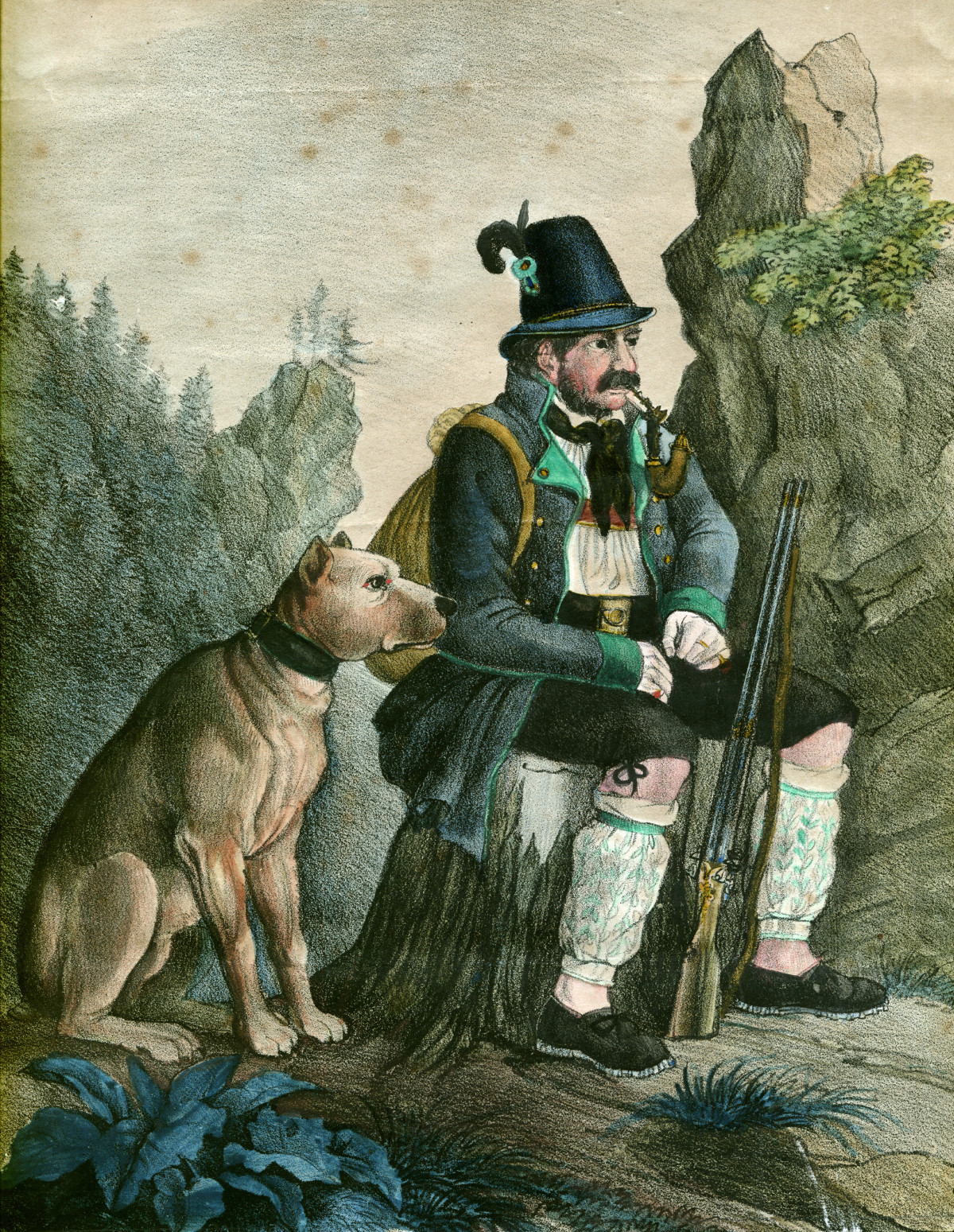Diese Zeichnung und die Nächste in dieser Sammlung sind zusammengehörig. Sieht man sich das Schloss des Gewehres genauer an, bemerkt man die Schrauben zum Verklemmen des Feuersteins, welche für Steinschlosswaffen typisch sind. Die beiden Zeichnungen machen ganz den Eindruck einer Auftragsarbeit von einem routinierten Zeichner. Durchaus möglich, dass sich damals ein neureicher Müller oder ein ähnlicher Geselle eine Jagd im Gebirge gepachtet hatte und sich und seinen Sohn im Jagdgewand verewigen ließ. Fotoapparate gab es damals ja noch nicht...