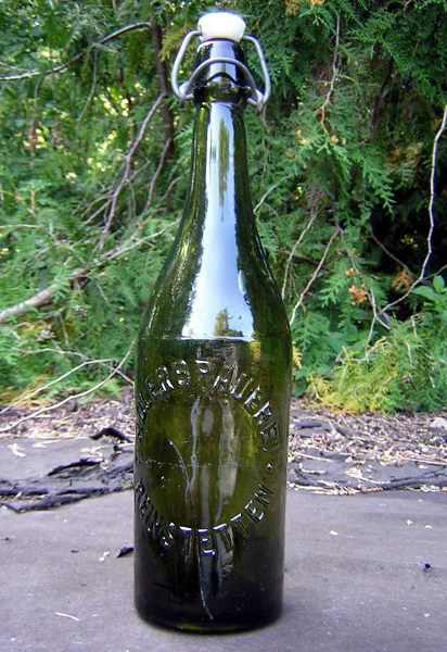 Frühe Bierflasche aus der Zeit um 1910 der Adlerbrauerei Reinstetten (gegründet 1898). Auf der Flasche waren keine Etiketten angebracht, sondern Brauereiname und -ort war in das Glas der Flasche geprägt, vermutlich, weil es noch kein firmenübergreifendes Pfandsystem gab. Wird die Flasche bis zum Rand gefüllt, fasst sie 0,7 Liter, weshalb die nominale Füllmenge der Flasche das von der NS-Regierung in den Dreißiger Jahren abgeschaffte Maß von 2/3 Liter betragen haben dürfte.