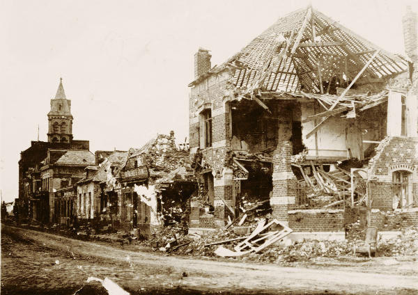 Dieses Haus wurde wohl durch den Treffer einer schweren Granate oder einer Bombe zerstört. Diese Aufnahme entstand während des Ersten Weltkrieges, irgendwo in Nordfrankreich oder in Belgien. Vermutlich zu Beginn, als dieser Anblick noch sensationell war. Angepeilt hatte der Artilleriebeobachter wohl den Kirchturm im Hintergrund, falls wirklich eine schwere Granate den Schaden verursacht hat. Hoffentlich waren da keine Zivilisten mehr drin...