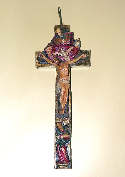 Ein mit Taube, Gottvater- und Marienfigur geschmücktes, bemaltes Kruzifix aus Wachs - vermutlich aus dem 19. Jahrhundert. Bei dieser barock geschmückten Devotionalie dürfte es um ein Mitbringsel von einer Wallfahrt handeln. Leider gibt es bei diesem Objekt keinen Hinweis auf den Zielort einer solchen frommen Reise, es sei denn, es handele sich um eine wächserne Kopie des verehrten Gegenstandes selbst. Wenn man bedenkt, dass die Form für diesen Wachsguß wohl über viele Jahrzehnte in Gebrauch war, könnte das Kruzifix auch aus dem frühen 20. Jahrhundert stammen. Auf jeden Fall ein nettes Zeugnis der Volksfrömmigkeit. Maße ca. 19 x 7,5 cm.