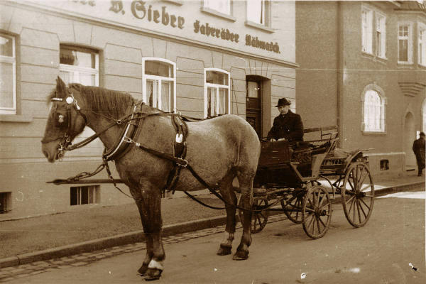 Eine einspännige Auslieferungskutsche zum schnellen Transport leichter Güter um das Jahr 1925. Heutzutage nehmen die Transporter der großen Automobilhersteller diese Aufgaben wahr. Ob sie aber im innerstädtischen Verkehr diese Aufgaben auch immer schneller erfüllen können als ihre nichtmotorisierten Vorgänger, sei mal dahingestellt...